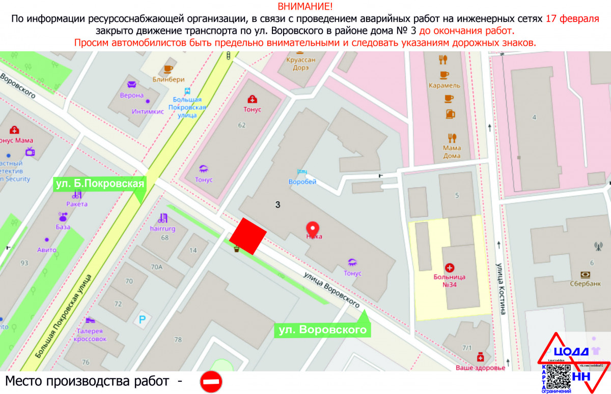 Движение транспорта по улице Воровского (в районе дома № 3) закрыто в связи с проведением аварийных работ на инженерных сетях до окончания работ. Об этом сообщает пресс-служба администрации Нижнего Новгорода.