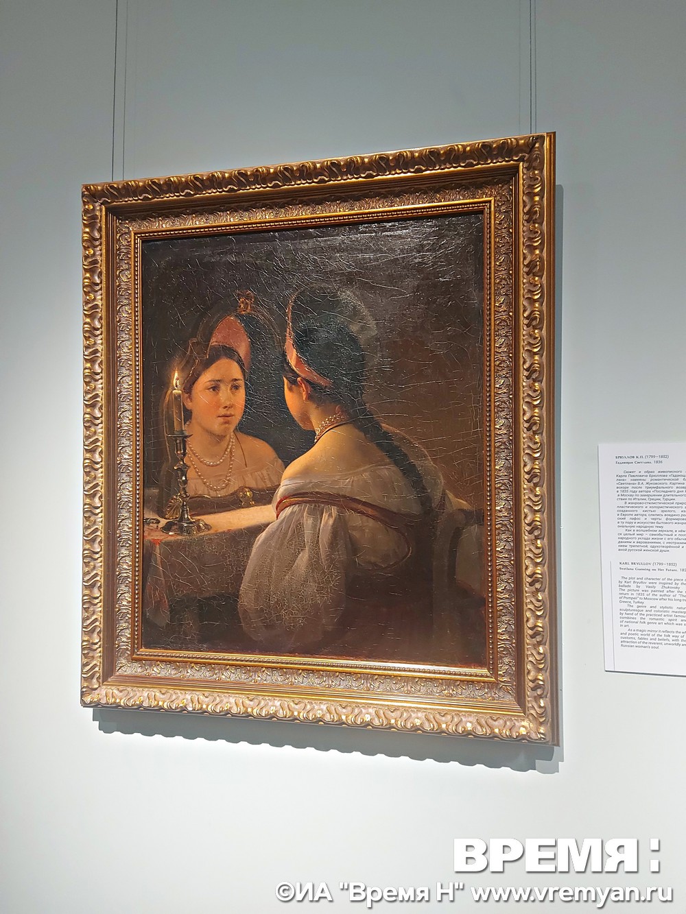 «Здесь представлена характерная для мистического искусства концепция разделения мира — на физический и потусторонний. Героиня воспринимается со спины, а ее лицо мы видим уже в зазеркалье, то есть в мире теней. Что касается ее облика — приталенный сарафан с декольте, предметов, окружающих ее, — все это элементы идеализации образа. Через внешнюю красоту Брюллов повествует о внутренней гармонии и красоте Светланы», — пояснил Алексей Гурин.