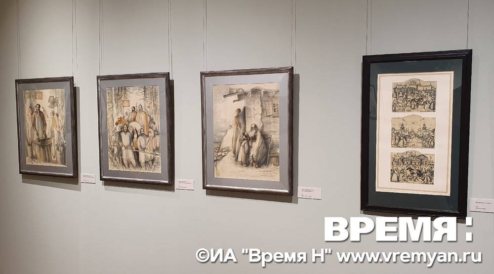 Особое место в экспозиции отведено работам на историко-патриотическую тематику, входящим в серию «Великие нижегородцы», например, произведение «Ополчение. На защиту Москвы», на которой изображено войско Козьмы Минина, отправляющееся в поход против польско-литовских интервентов. В эту же серию входят портреты протопопа Аввакума, архитектора М.П. Коринфского, художника А.В. Ступина и фотографа А.О. Карелина.