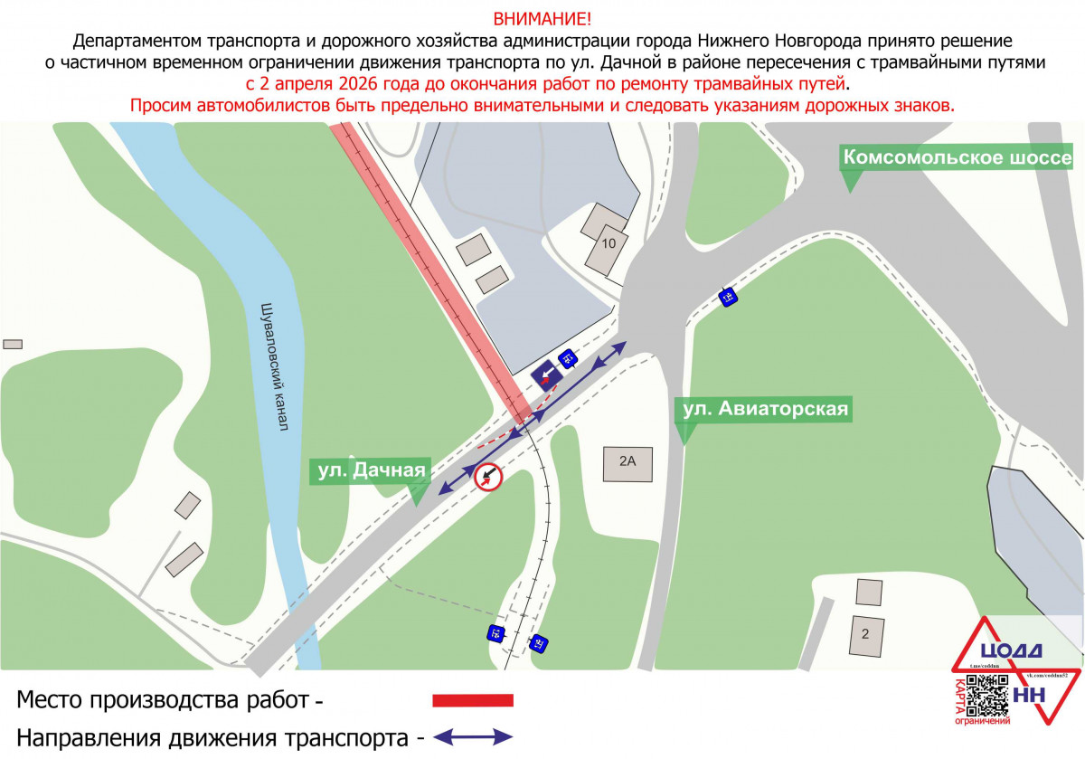 С 2 апреля до окончания работ будет частично ограничено движение транспорта по улице Дачная — на пересечении с трамвайными путями — в связи с проведением работ по сооружению монолитных участков трамвайных путей. Об этом сообщает пресс-служба администрации Нижнего Новгорода.