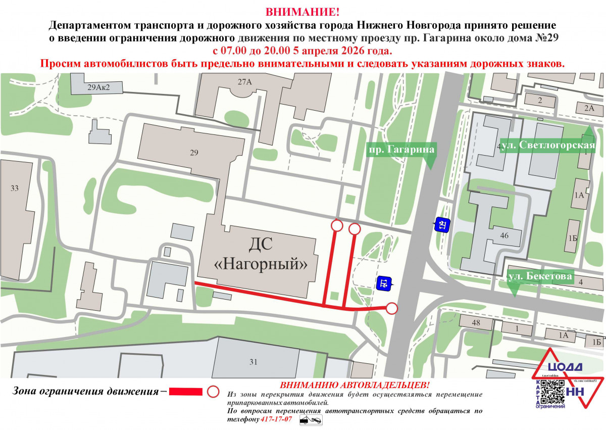 С 07:00 до 20:00 5 апреля будет ограничено движение транспорта по местному проезду проспекта Гагарина — около дома № 29 в связи с проведением спортивных мероприятий, сообщает пресс-служба администрации Нижнего Новгорода.