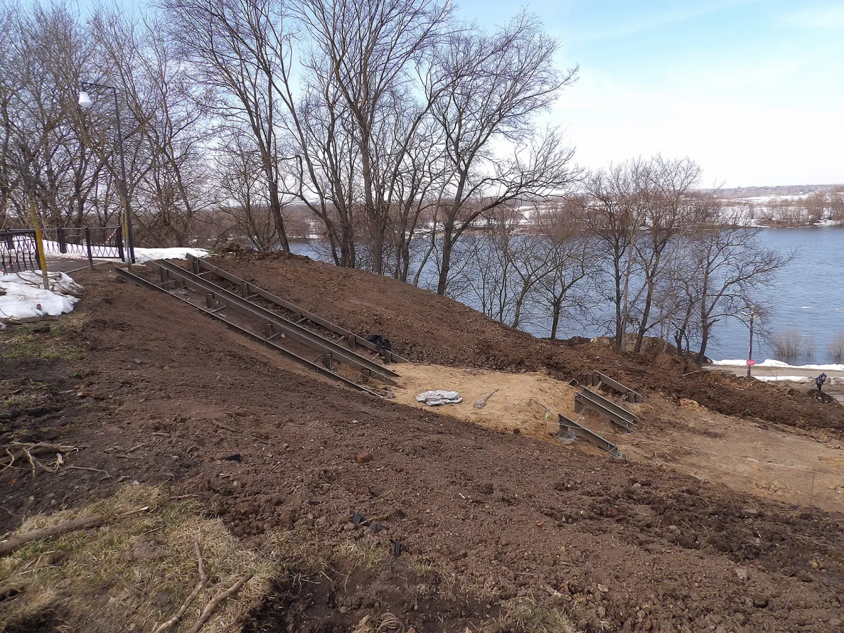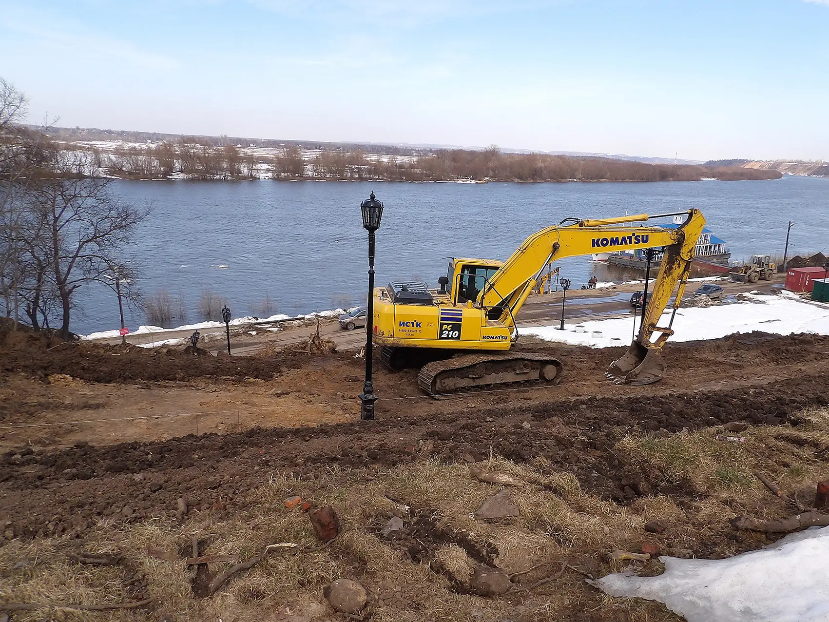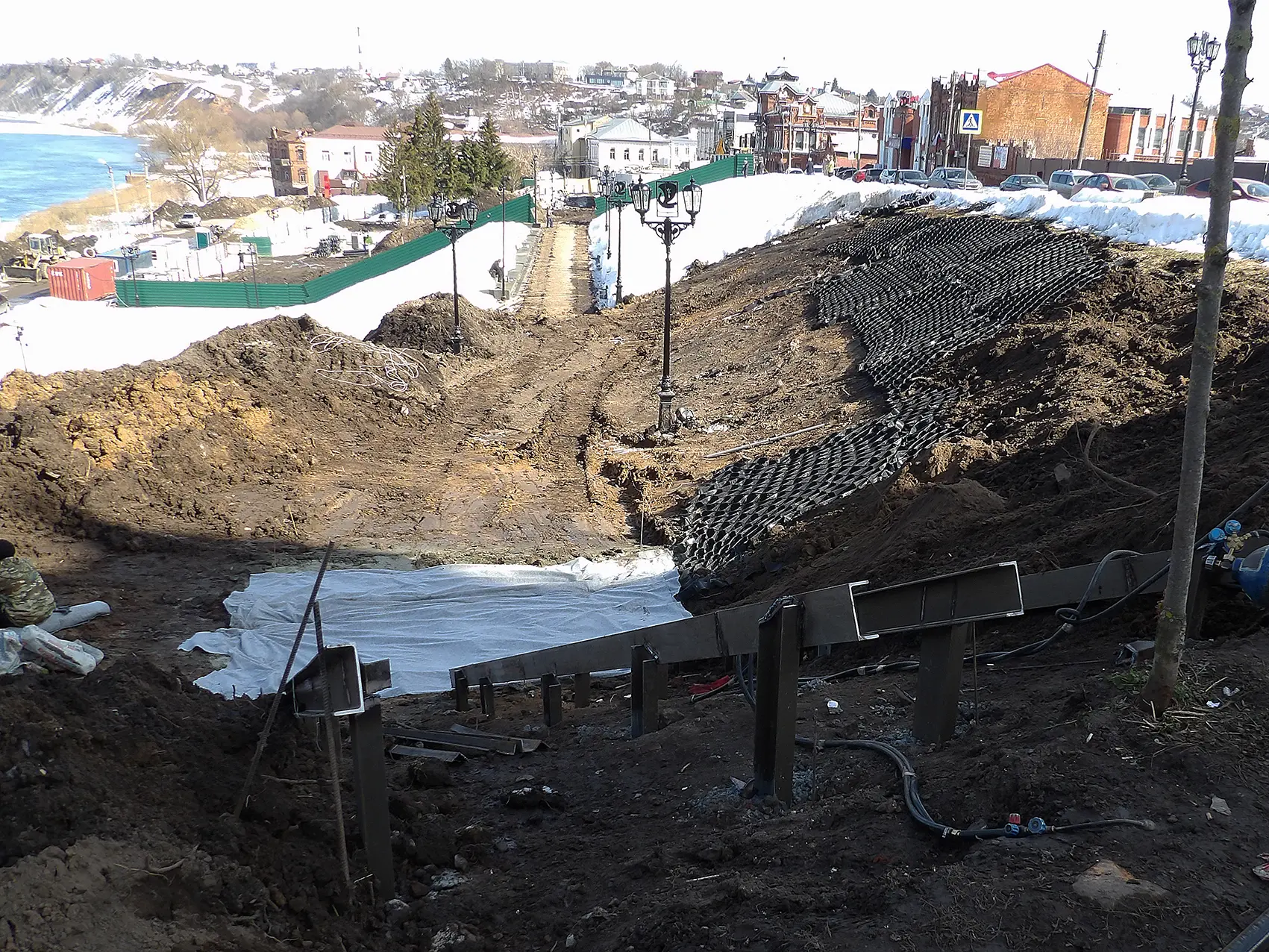 Параллельно идет планировка склонов — практически закончена верхняя часть: на первом уровне уложены геотекстиль и георешетка, проведена отсыпка и подготовка площадки под газоны. Ведется монтаж лестницы, которая выводит к Воскресенской церкви, планируется дорожка между чашами фонтана (средний уровень). В первой декаде апреля запланировано начало работ по укладке брусчатки.