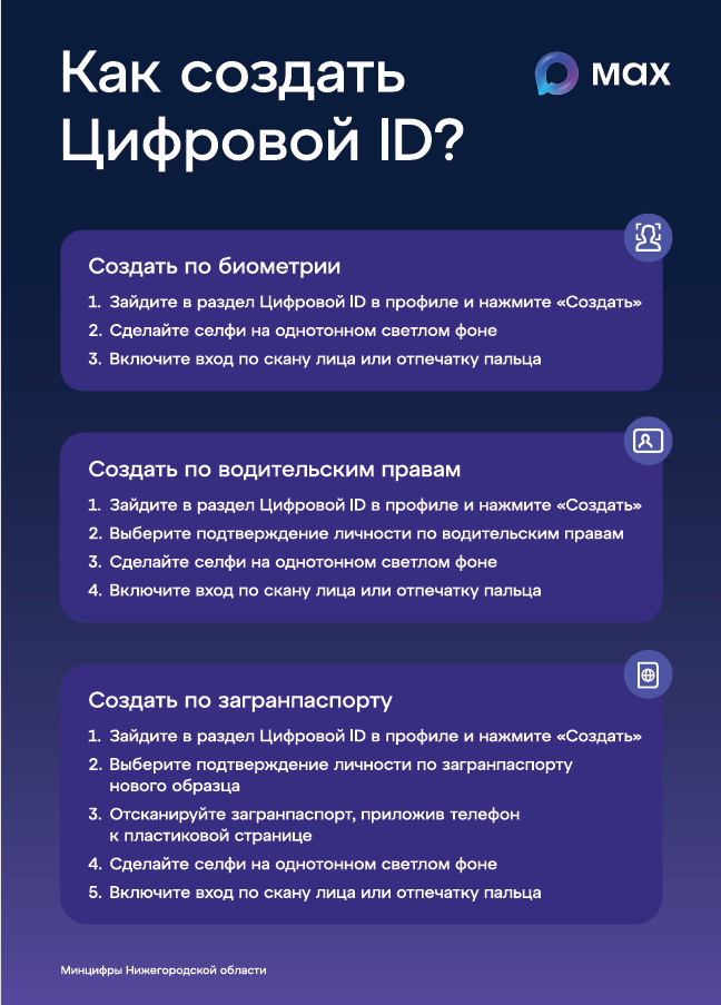 Чтобы воспользоваться Цифровым ID, необходимо открыть профиль в MAX. Затем нужно выбрать «Цифровой ID», нажать на карточку подтверждения возраста, статуса студента или многодетного.