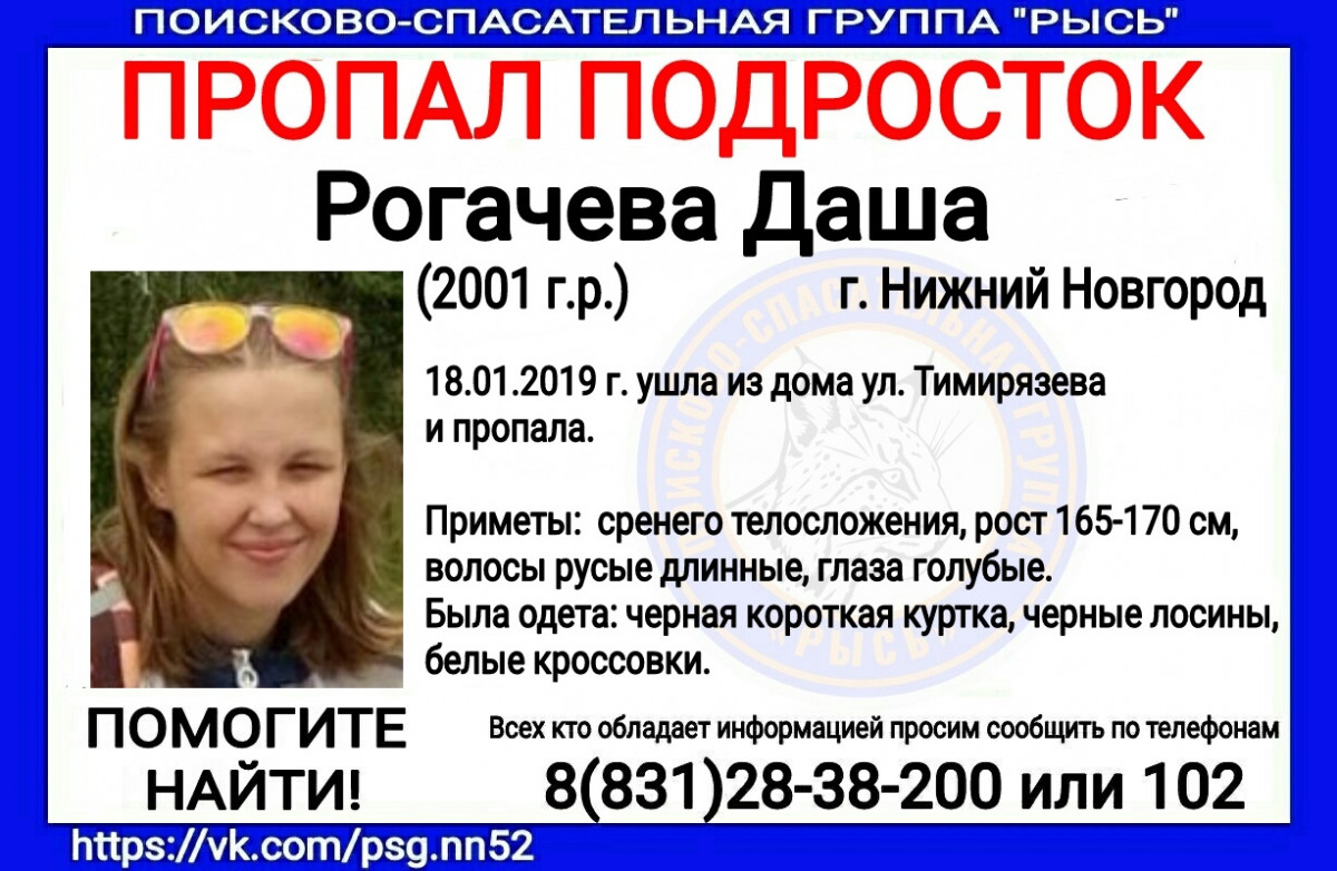17-летняя Дарья Рогачева пропала в Нижнем Новгороде, сообщает на странице в соцсети ПСГ «Рысь».