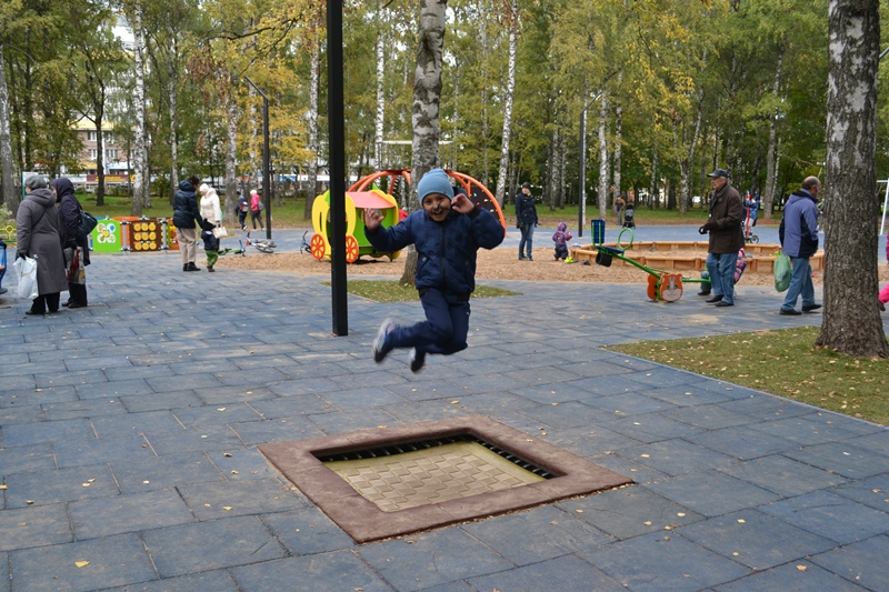 На детской площадке сделали мягкое покрытие из резиновых плиток, разноцветные детские городки и небольшой батут.