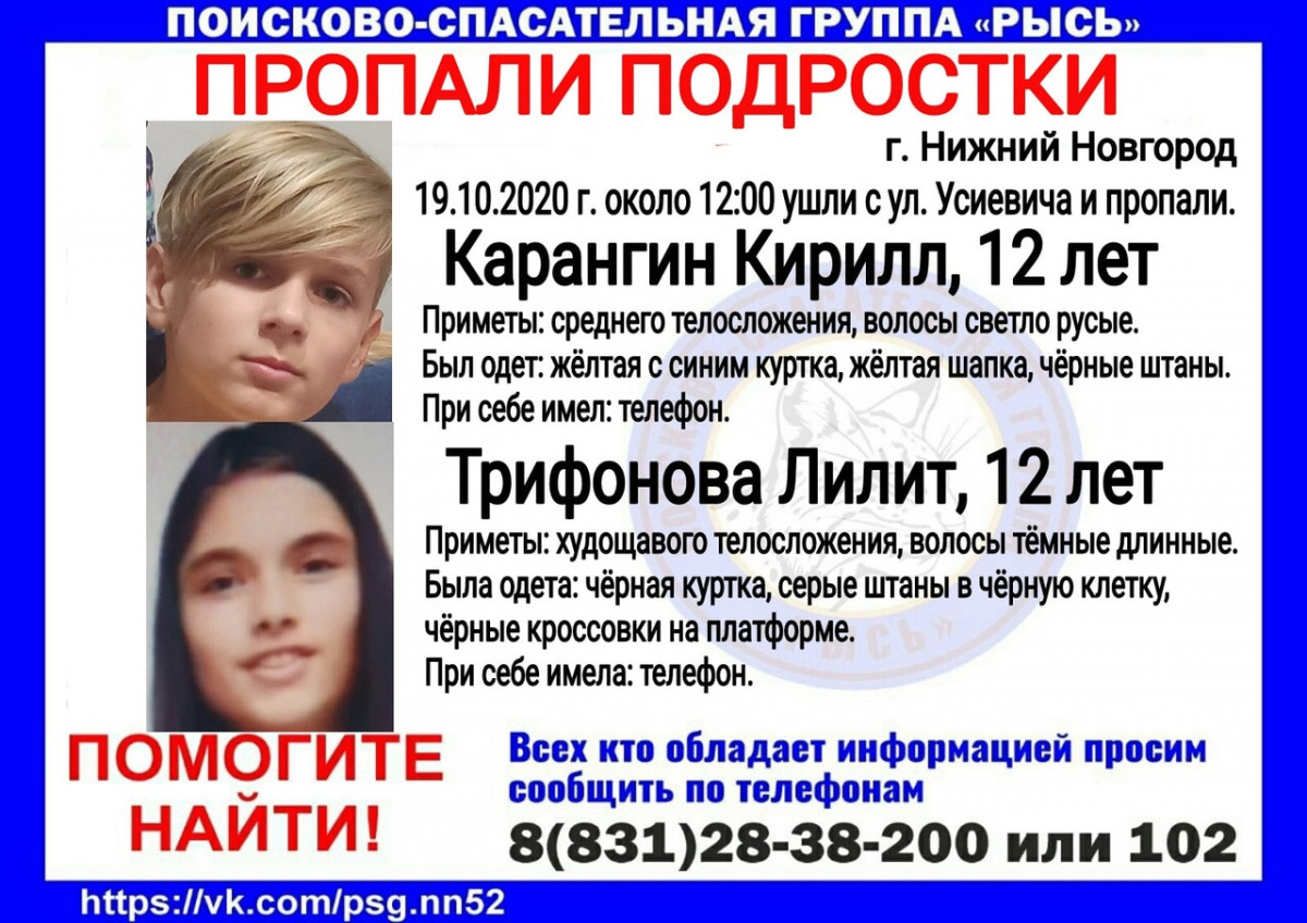 12-летние Кирилл Карангин и Лилит Трифонова пропали в Нижнем Новгороде 19 октября, сообщает ПСГ «Рысь».