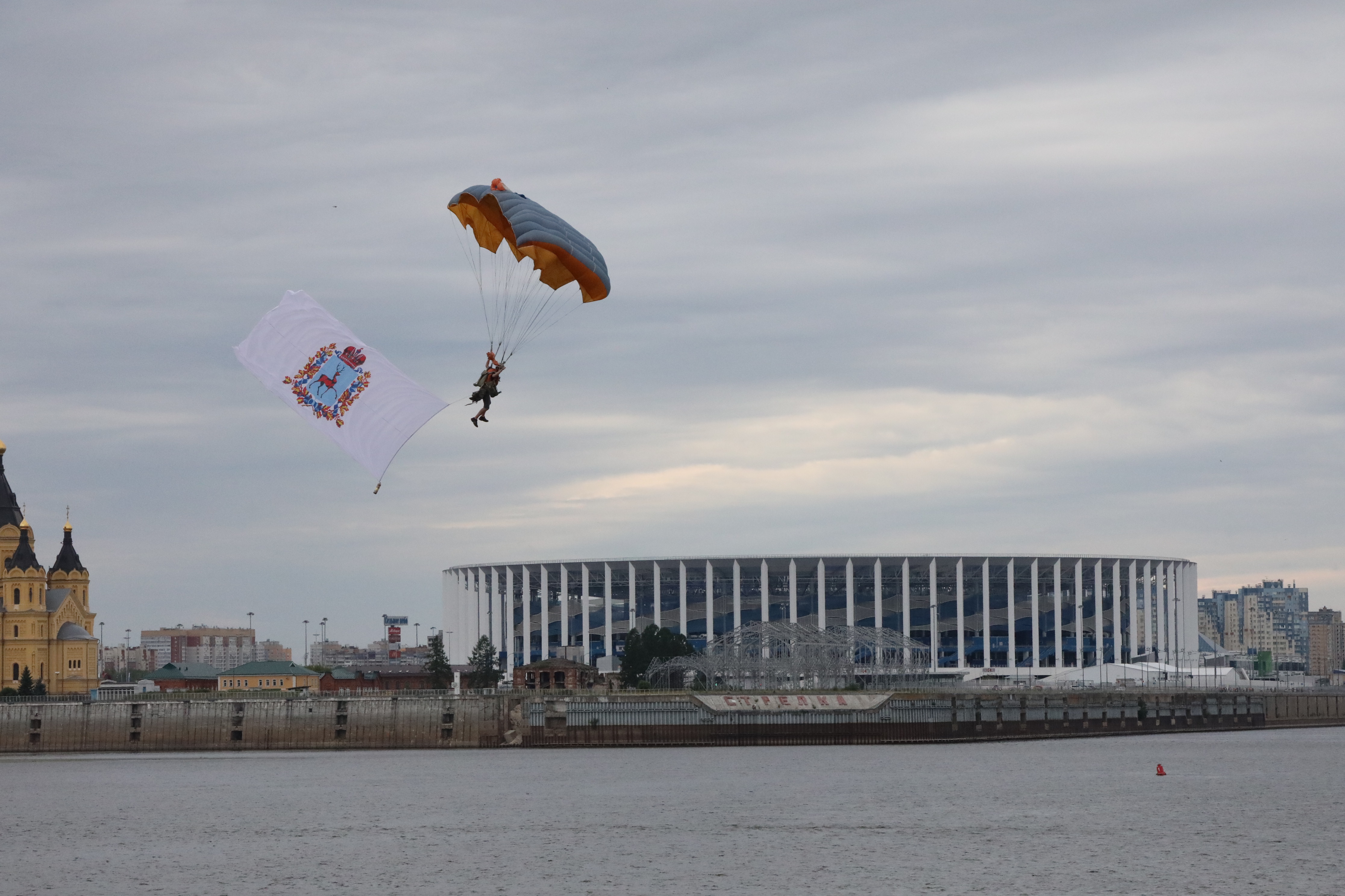 Гости площадки стали свидетелями получасового авиашоу, в ходе которого шесть парашютистов приземлились на набережной с флагами России, Нижегородской области и проекта «Команда 800».
