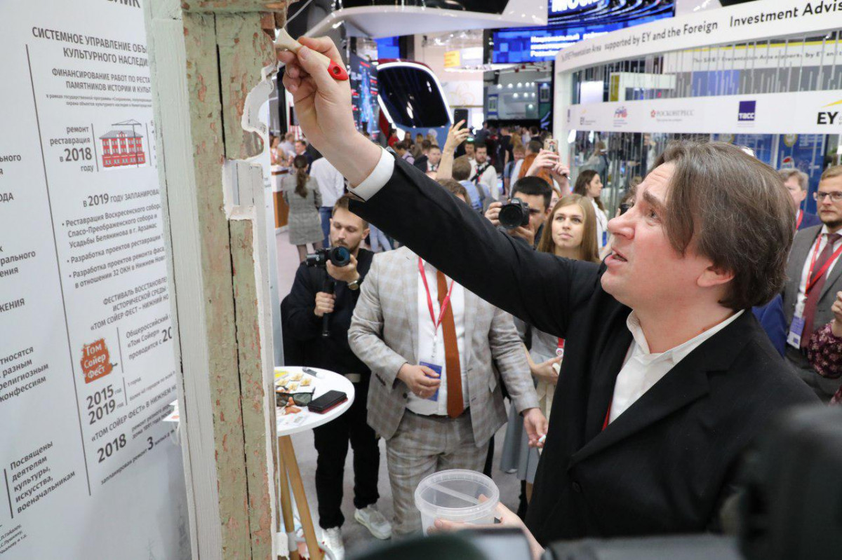 Напомним, гости ПМЭФ-2019 помогают восстанавливать деревянный наличник, привезенный из Нижнего Новгорода. В рамках фестиваля «Том Сойер Фесте» они привлекаются к окраске наличника, символизирующего важность сохранения культурных объектов и редевелопмента исторических территорий.