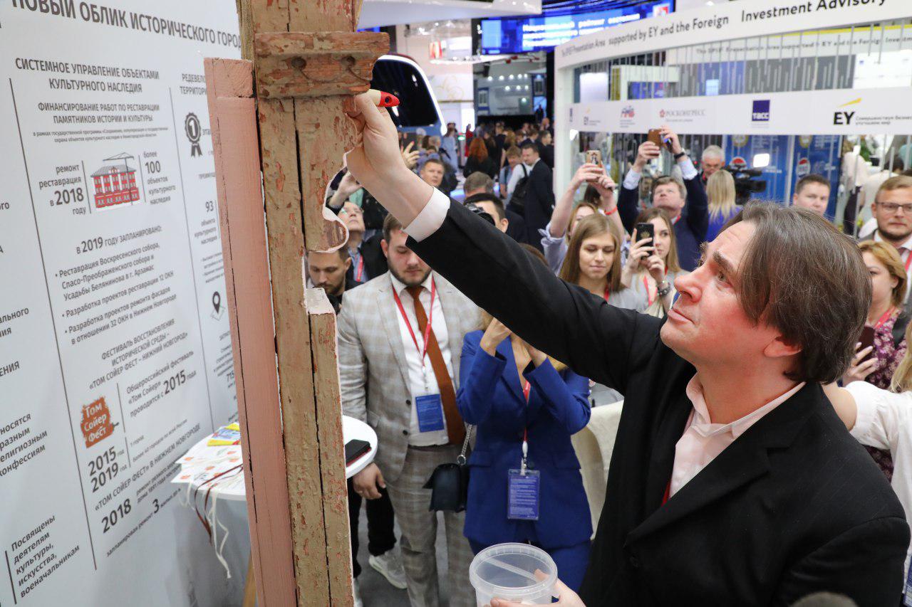 В рамках осмотра стенда Нижегородской области на ПМЭФ гости красят небольшие участки наличника с дома № 22а на улице Новой, которому более 170 лет. В настоящее время эта постройка реконструируется в Нижнем Новгороде в рамках фестиваля «Том Сойер Фест».