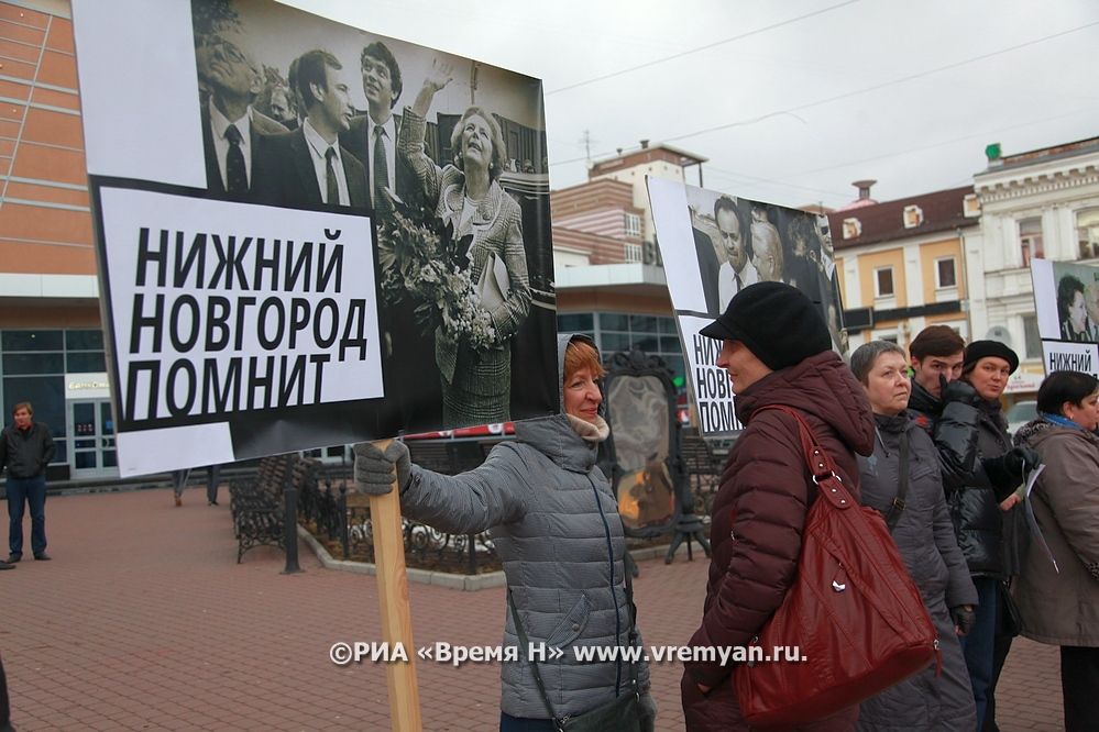 Неравнодушные нижегородцы собрались перед кинотеатром «Октябрь» с плакатами «Нижний Новгород помнит», «Борис, спасибо», «Герои не умирают», «Спасибо за то, что ты был с нами», «Не забудем, не простим». К портрету Немцова несли цветы.