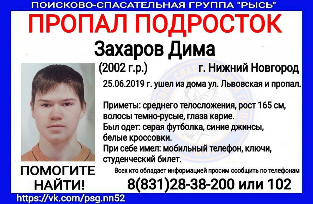 Волонтеры просят помощи в поисках 17-летнего Дмитрия Захарова, пропавшего в Нижнем Новгороде 25 июня, сообщает ПСГ «Рысь».