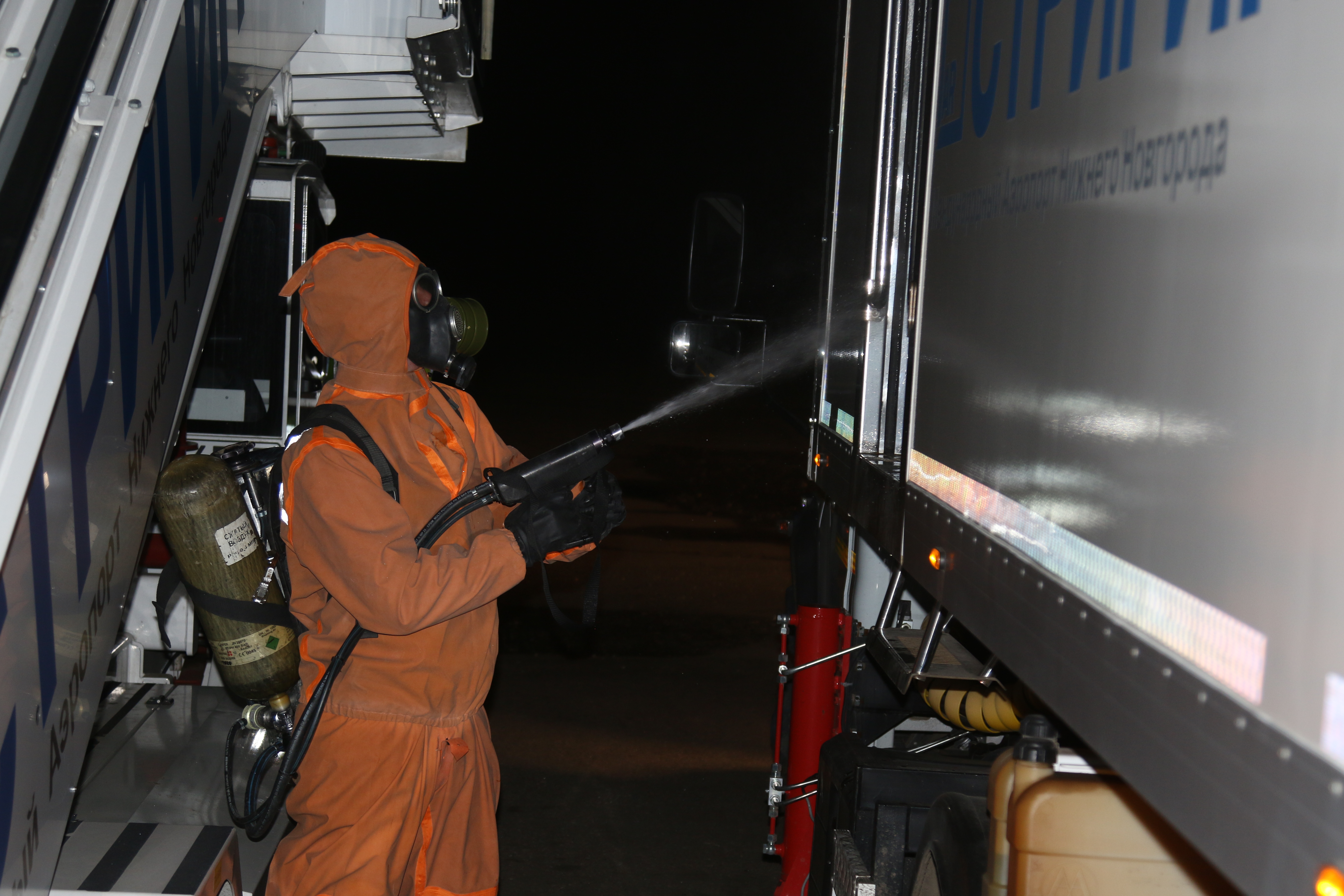Сотрудники в защитных костюмах при помощи специального оборудования провели обработку на площади более 20 тысяч кв. м. Кроме пассажирского терминала дезинфицирующий состав нанесли на транспортные средства для перевозки пассажиров и грузов. В качестве антисептика был выбран раствор гипохлорита кальция.