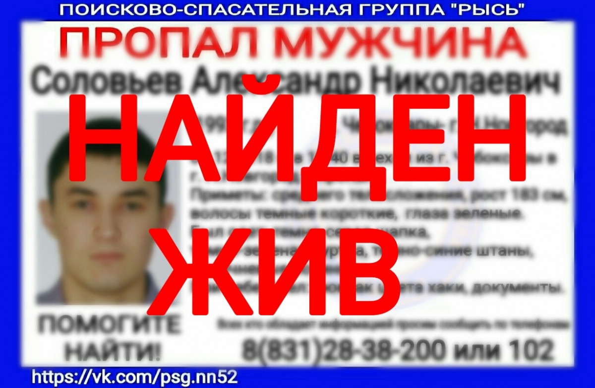 Пропавший по пути из Чебоксар в Нижний Новгород Александр Соловьев найден живым 9 января 2019 года, сообщает ПСГ «Рысь».