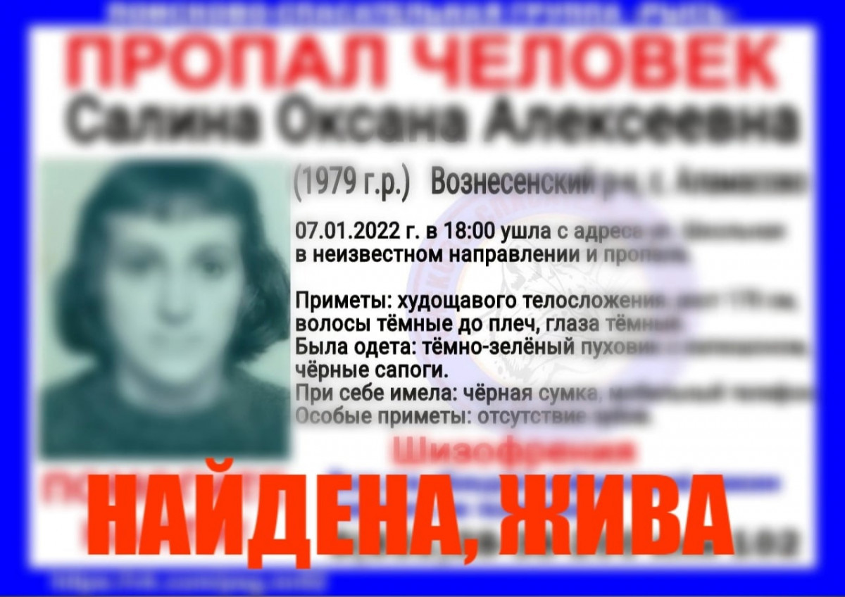 43-летнюю Оксану Салину, пропавшую в селе Аламасово Вознесенского района, нашли живой, сообщается на странице поисково-спасательного центра «Рысь» в сети «ВКонтакте».
