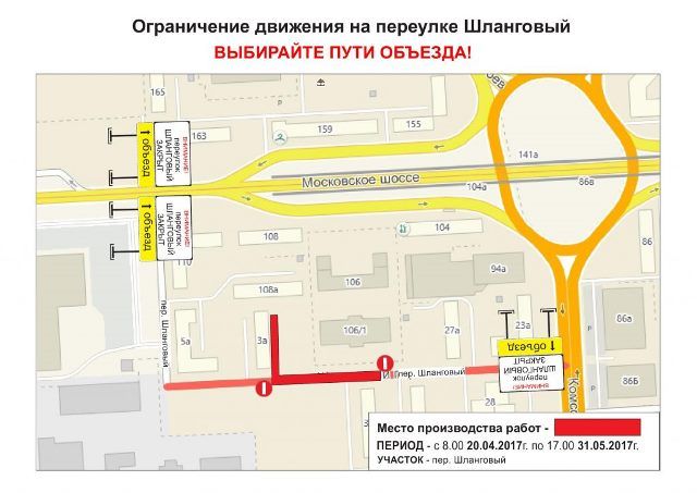 Согласно информации, движение будет перекрыто из-за проведения строительных работ между домами № 32 по улице Аэродромной и № 3а по переулку Шланговый.