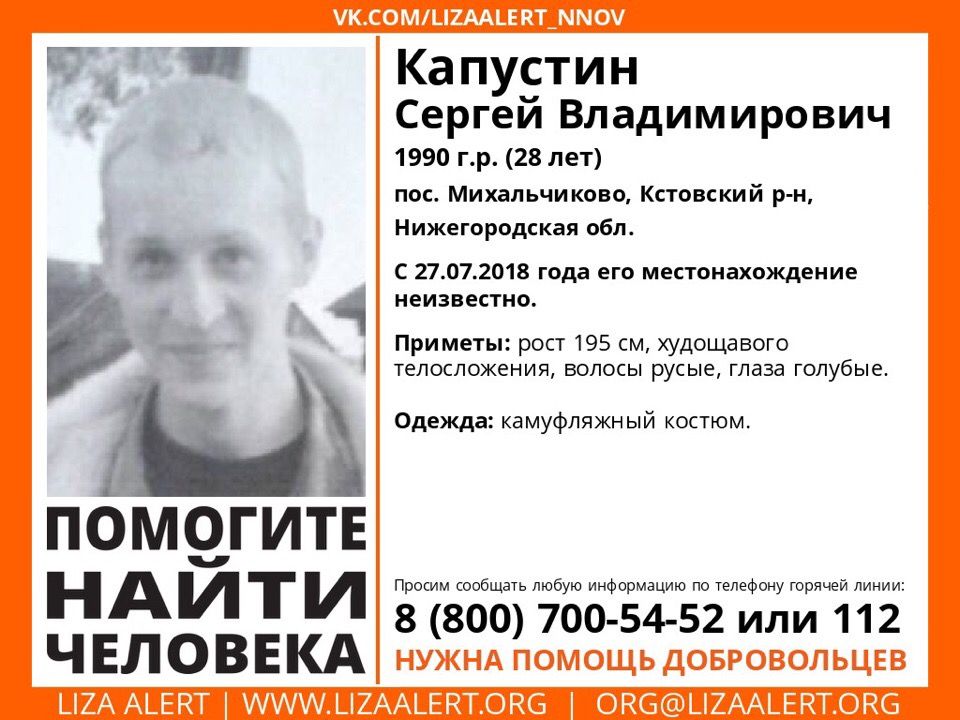 Волонтеры просят помощи в поисках 28-летнего Сергея Капустина, пропавшего в Кстовском районе 27 июля, сообщает поисковый отряд «Лиза Алерт».